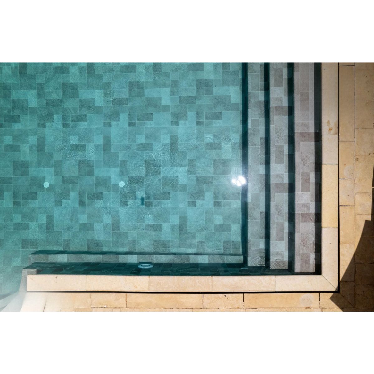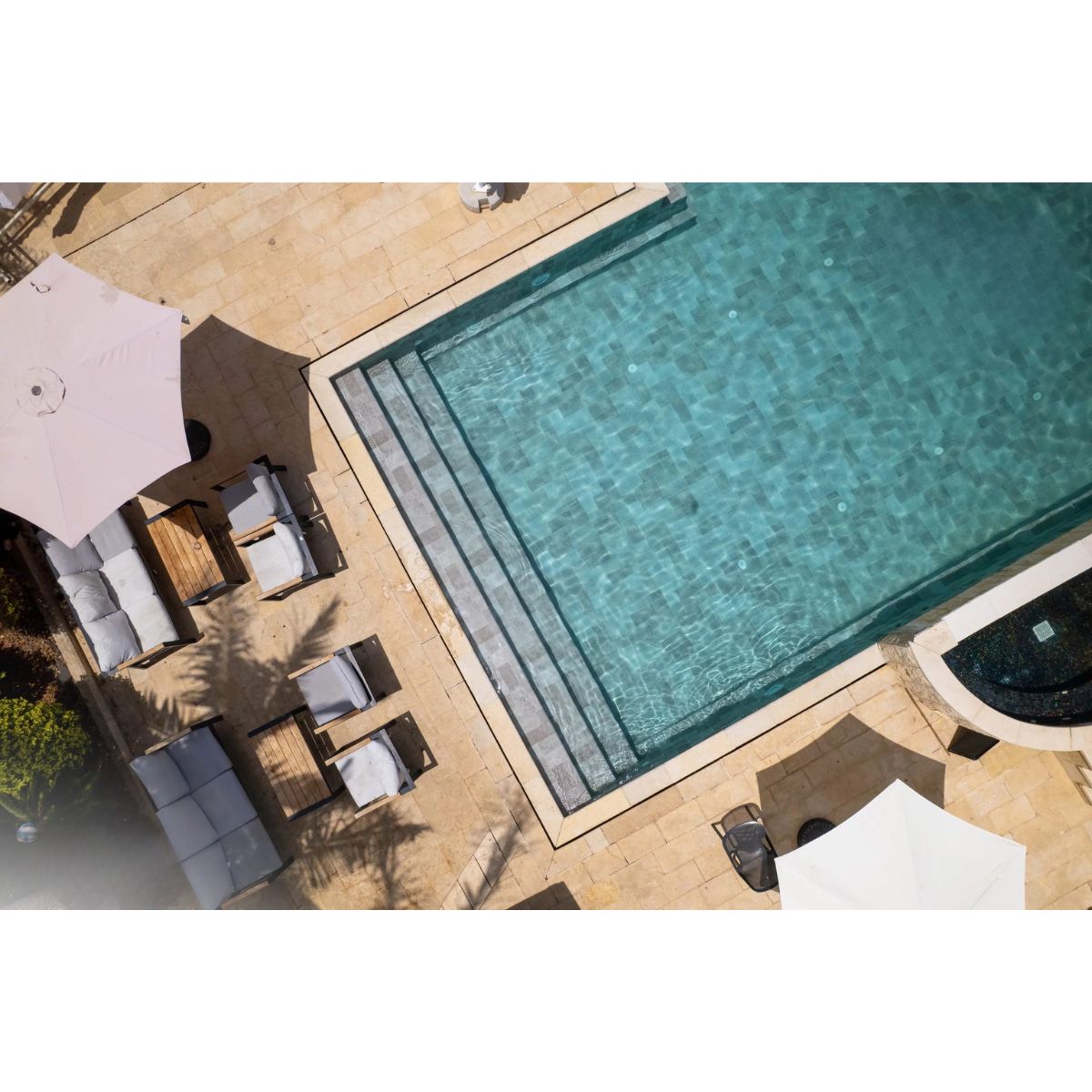 De moderne tegelpatronen en natuurlijke kleuren zorgen voor een stijlvolle en tijdloze zwembadafwerking die perfect past bij zowel moderne als klassieke zwembadontwerpen.