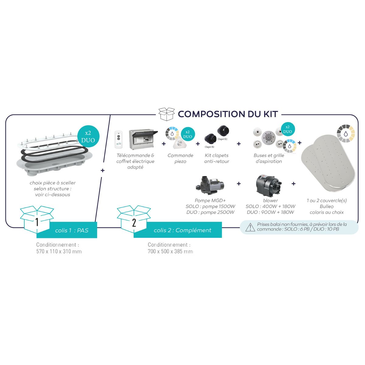 Bulléo Duo bruisplaten set wit, bestaat uit: 2 bruisplaten, verwarmde blower (900 W + 180 W), MDGD+ pomp 2 HP, 230 V, aanzuiging, jets, behuizing, besturingskast, piëzo-bediening en terugslagkleppen (excl. 2 x inbouwdeel HRS08206, HRS08207 of HRS0820