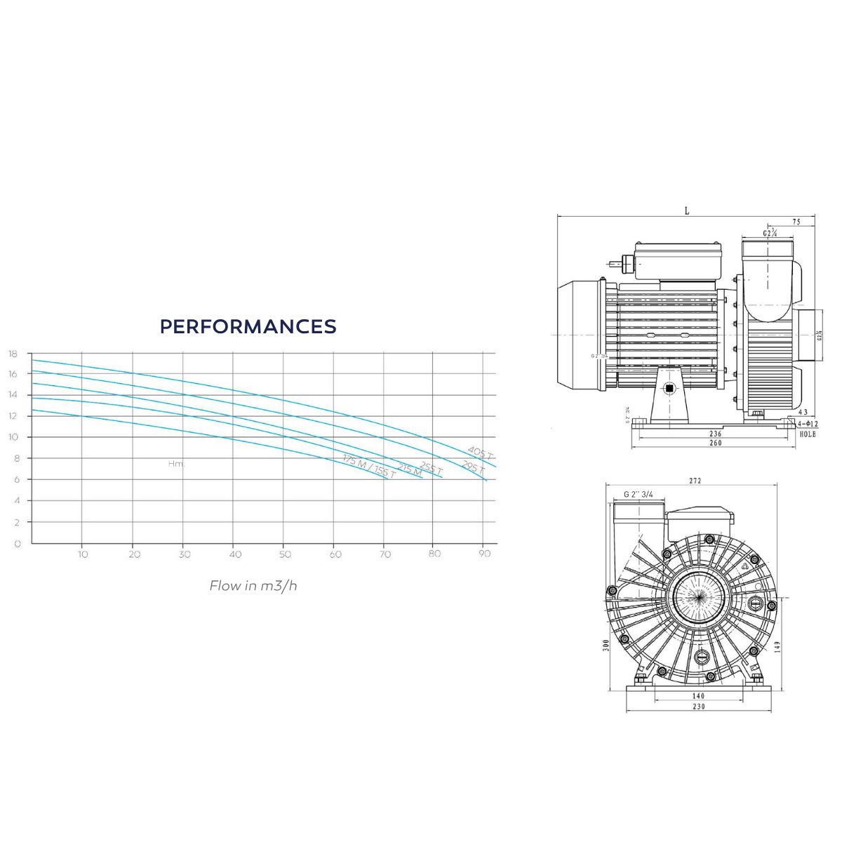 Tegenstroompomp 255T, 70 m³/h bij 8 m mwk, 230/400 V, 3,5 HP, 8,3/4,8 A, geschikt voor jetstreams en hydrotherapie-installaties